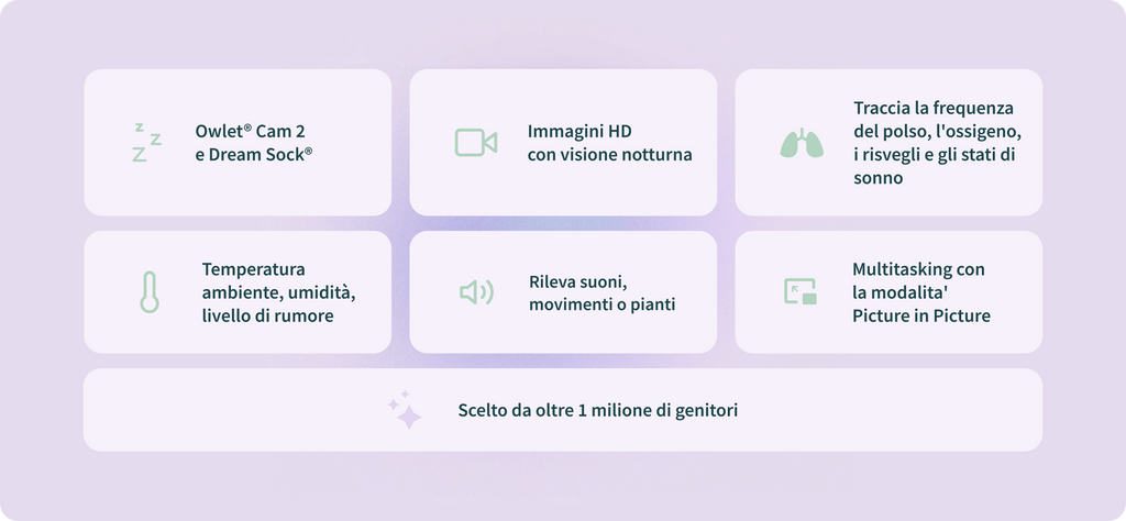 Vedere, ascoltare ed essere sicuri che il bambino sta bene grazie al baby monitor più avanzato, offerto da Owlet. Il monitor video intelligente Owlet Cam 2 e il baby monitor intelligente Dream SockTM, il primo nel suo genere e con certificazione sanitaria, consentono di visualizzare e monitorare la frequenza cardiaca (battito), i livelli di ossigeno e i ritmi del sonno del bambino, oltre a visualizzare video HD in streaming sul telefono. Goditi la massima tranquillità: la nostra tecnologia avanzata offre una precisione clinicamente testata e di livello medico, avvisandoti, nell'app Owlet Dream e nella base inclusa, tutte le volte in cui la frequenza cardiaca o i livelli di ossigeno del bambino non rientrano negli intervalli preimpostati. Con Owlet Cam 2, si riceveranno anche notifiche all’interno dell’app quando vengono rilevati suoni, movimenti o pianti, in modo da poter determinare se è necessario prestare assistenza. Questo pacchetto Dream offre il perfetto connubio tra tecnologia, sicurezza e tranquillità.